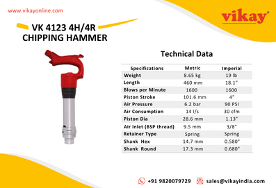 Vikay Mining Equipments is a worldwide distributor of OEM quality VK 4123 Meißelhammer - technically equivalent to CP 4123 Pneumatic Chippers suitable for wide variety of construction and industrial applications, from light to medium chipping to heavy cutting from India.